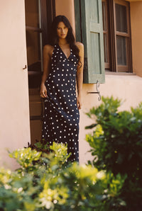 Goldie is a timeless maxi dress with a vintage shape, adjustable halter neck, and an open back. It’s on the bias which means it will hug your curves without feeling fitted.