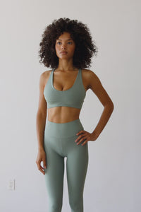 Our cult favorite active fabric! Made with recycled poly interlock that is lighter than air making it breathable, but still very stretchy. It has a very subtle shine on the surface.